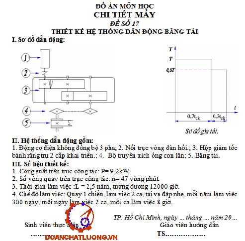 - Chế độ làm việc: Quay 1 chiều, làm việc 2 ca, tải va đập nhẹ, mỗi năm làm việc 300 ngày, mỗi ngày làm việc 2 ca, mỗi ca làm việc 8 giờ.