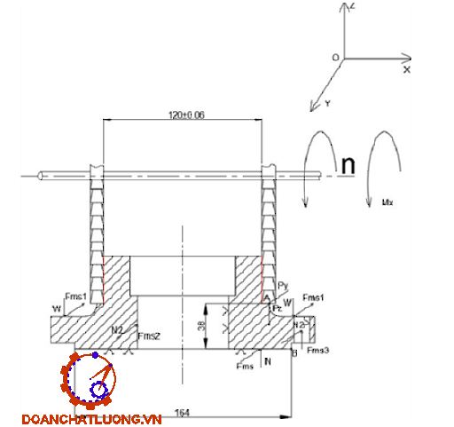 Tính lực kẹp để chi tiết không bị quay quanh Ox. Ta có phương trình cân bằng: (Xét tại vị trí A)