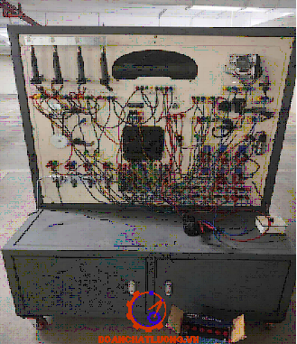 Các bộ phận của mô hình hệ thống được bố trí tập trung trên mặt bảng điều khiển theo nguyên tắc gọn gàng, khoa học và thuận tiện cho việc quan sát cũng như đấu nối. Các bobin đánh lửa và bugi được lắp đặt theo hàng ngang phía trên bảng, cố định chắc chắn bằng giá đỡ kim loại, đảm bảo khoảng cách đồng đều giữa các phần tử và an toàn trong quá trình vận hành. Phía dưới mỗi bobin là các cổng đấu dây được ký hiệu rõ ràng, giúp việc kết nối điện và kiểm tra tín hiệu được thực hiện dễ dàng.