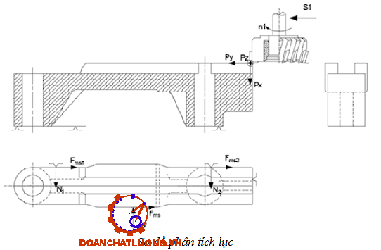 - Bước 2: Xác định lực cắt và momen cắt, phương chiều và điểm đặt lực kẹp và các lực cùng tác động vào chi tiết như trọng lực của chi tiết G, phản lực tại các điểm N, lực ma sát Fms … trong quá trình gia công. Xác định các điểm nguy hiểm mà lực cắt momen cắt có thể gây ra. Sau đó viết phương trình cân bằng về lực để xác định giá trị kẹp cần thiết.