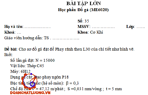 Bài tập lớn có dung lượng 65MB. Bao gồm đầy đủ các file như: File bản vẽ cad 2D (Bản vẽ lắp đồ gá phay rãnh, bản vẽ phân rã đồ gá phay rãnh…); file word (Bản thuyết minh, nhiệm vụ đề tài, bìa thuyết minh…). Ngoài ra còn cung cấp rất nhiều các tài liệu chuyên ngành, các tài liệu phục vụ cho thiết kế đồ án, thư viện dao gia công và chi tiết đồ gá tiêu chuẩn........... THIẾT KẾ ĐỒ GÁ PHAY RÃNH THEN L30 TRÊN TRỤC.