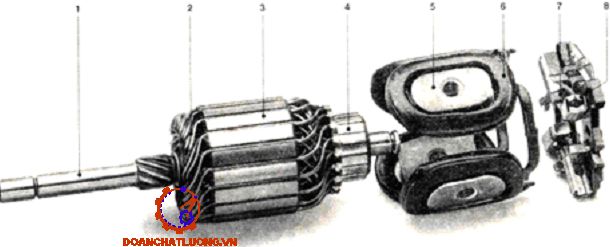 - Roto: gồm trục, khối thép từ, cuộn dây phần ứng và vành đổi điện; các nắp với các giá chổi điện và chổi điện, các ổ trượt (bạc).