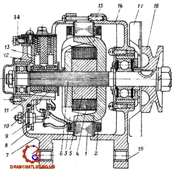 - Stato: gồm vỏ máy, các má cực (thường là 4 má) và các cuộn dây kích thích, tương tự như máy phát điện một chiều.