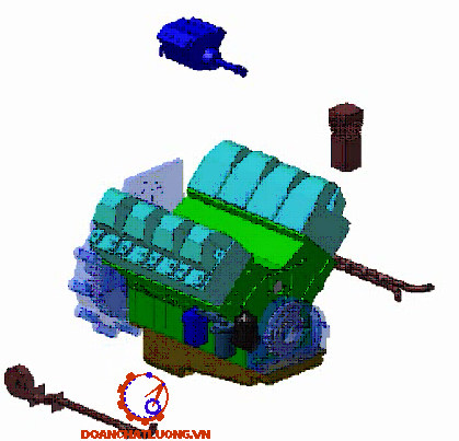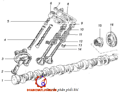- Bánh răng dẫn động, trục cam, các con đội, các đũa đẩy, đòn gánh, cơ cấu xupáp, các xupáp.