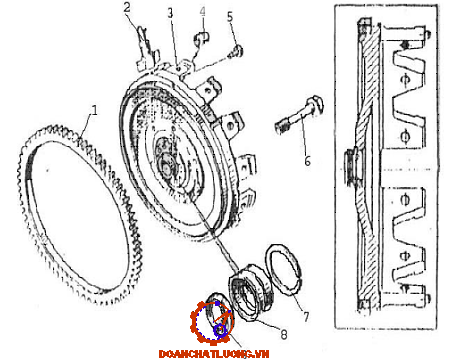 + Bánh đà: Được đúc bằng gang xám và được gắn với đuôi trục khuỷu nhờ 8 bu lông. Mặt ngoài bánh đà được ép một vành răng để khởi động động cơ bằng động cơ điện. Trên bề mặt bánh đà được gia công rãnh định vị để phục cho việc đặt góc phun sớm và điều chỉnh khe hở nhiệt xupáp.