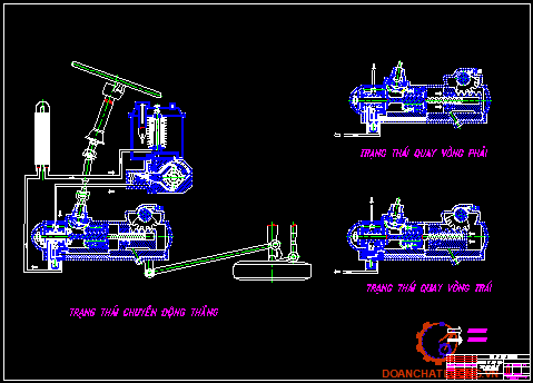 c. Quay vòng trái (hình 2.4.III): Trục vít chuyển động xuống dưới, con trượt (14) chuyển động xuống dưới mở đường dầu vào khoang bên trái của xi lanh lực đồng thời đóng đường dầu vào khoang bên phải của xi lanh lực, dầu có áp suất cao của khoang bên trái của xi lanh lực sẽ đẩy pit tông chuyển động sang phải dẫn động hệ thống lái, dầu ở khoang bên phải của xi lanh lực qua cơ cấu phân phối trở về bình chứa dầu.