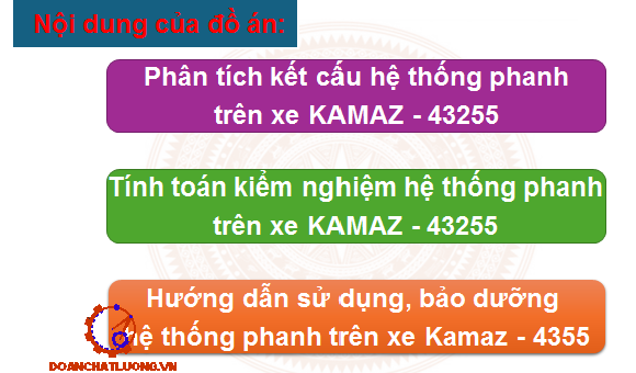 Trên xe hệ thống đảm bảo an toàn chuyển động của xe là hệ thống phanh, chỉ tiêu an toàn của xe được đánh giá bằng hiệu quả phanh. Hệ thống phanh có đảm bảo độ tin cậy mới góp phần tạo điều kiện cho người lái xe điều khiển xe dễ dàng và linh hoạt, đồng thời duy trì được tốc độ của xe theo ý muốn trên mọi địa hình khác nhau. Sau khi được trang bị kiến thức cơ bản về chuyên ngành xe quân sự em được giao nhiệm vụ đồ án tốt nghiệp: “Khai thác hệ thống phanh trên xe KAMAZ - 43255”. Nội dung chính của đồ án bao gồm các phần sau: