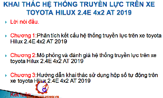 Với những lý do đó, tôi được giao đồ án tốt nghiệp với đề tài: “Khai thác hệ thống truyền lực trên xe Toyota Hilux 2.4E 4x2 AT 2019”. Nội dung chính của đồ án bao gồm các phần sau: