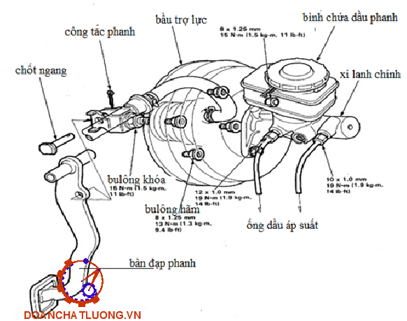 - Dẫn động của hệ thống phanh chính bao gồm: bàn đạp phanh, bộ trợ lực chân không, xi lanh phanh chính, cơ cấu tín hiệu, các đường ống dẫn và các ống mềm nối ghép giữa xi lanh phanh chính và các xi lanh bánh xe.