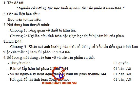 Đồ án có dung lượng 280MB. Bao gồm đầy đủ các file như: File bản vẽ cad 2D (Bản vẽ sơ đồ nguyên lý máy hãm lùi pháo nòng dài 85mm-D44, bản vẽ lắp máy hãm lùi pháo 85mm-D44, bản vẽ đồ thị matlab… ); file word (Bản thuyết minh, nhiệm vụ đồ án, bìa đồ án… ). Ngoài ra còn cung cấp rất nhiều các tài liệu chuyên ngành, các tài liệu phục vụ cho thiết kế đồ án, thư viện chi tiết tiêu chuẩn............ NGHIÊN CỨU ĐỘNG LỰC HỌC THIẾT BỊ HÃM LÙI CỦA PHÁO 85mm-D44.
