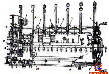 Mỗi khối xi lanh bao gồm: áo xi lanh 7, sáu xi lanh bằng thép 6 và nắp máy 10 cùng nắp đậy 8.