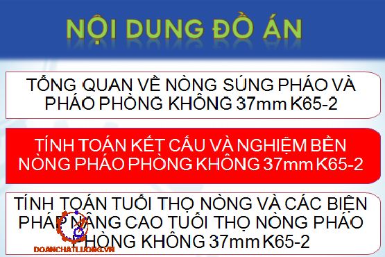 Đồ án có dung lượng 290MB. Bao gồm đầy đủ các file như: File bản vẽ cad 2D (Bản vẽ nòng pháo phòng không 37mm K65-2, bản vẽ sơ đồ tính toán tuổi thọ và biện pháp nâng cao tuổi thọ nòng pháo phòng không 37mm K65-2, bản vẽ biểu đồ áp suất và sức bền… ); file word (Bản thuyết minh, bìa đồ án, chương trình pháo phòng không 37mm K65-2, bản trình chiếu bảo vệ Power point… ). Ngoài ra còn cung cấp rất nhiều các tài liệu chuyên ngành, các tài liệu phục vụ cho thiết kế đồ án, thư viện chi tiết tiêu chuẩn............ NGHIÊN CỨU TÍNH TOÁN KẾT CẤU NÒNG VÀ BIỆN PHÁP NÂNG CAO TUỔI THỌ NÒNG PHÁO PHÒNG KHÔNG 37MM K65-2.