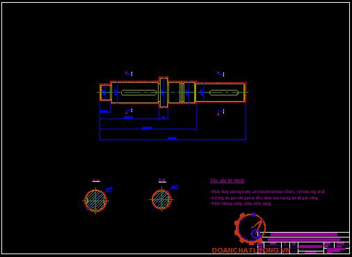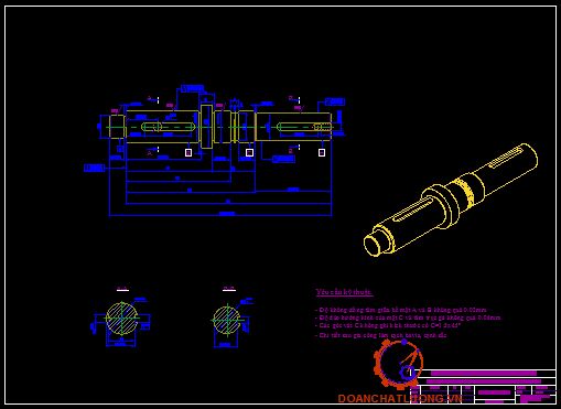 + Đảm bảo độ đồng tâm của các bề mặt làm việc so với bề mặt làm chuẩn A như trong bản vẽ ≤ 0.05. độ không song song của rãnh then so với tâm ≤ 0.05.