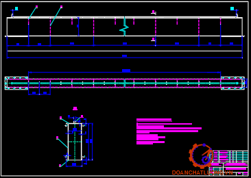 - Dầm chủ được chia làm 4 đoạn, liên kết với nhau bằng liên kết bu lông và tấm bản giằng. Các thanh giằng là thép chữ C liên kết với dầm chủ bằng liên kết hàn