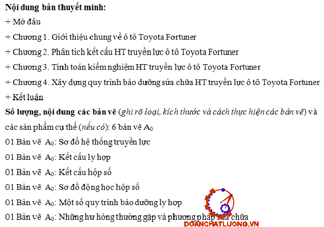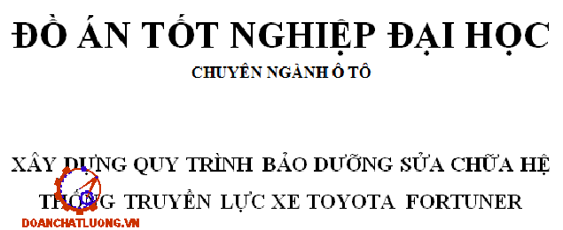Trong phạm vi một đồ án tốt nghiệp đại học, trong thời gian không nhiều với những kiến thức đã được học tại Học Viện và được sự giúp đỡ rất nhiệt tình của Thầy giáo : PGS.TS…………….., các thầy trong bộ môn Ô tô quân sự, các thầy trong Khoa Động Lực và các bạn đồng nghiệp,em đã hoàn thành bản đồ án tốt nghiệp: “Xây dựng quy trình bảo dưỡng sửa chữa hệ thống truyền lực trên xe Toyota Fortuner’’.