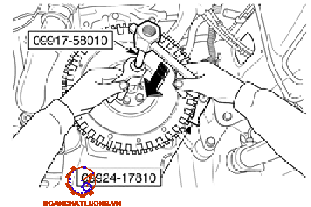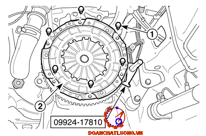 - Căn thẳng hàng bàn ép và đĩa ép và đĩa ma sát ly hợp trên bánh đà sử dụng lá trung tâm ly hợp DW2 10-010 và bánh đà 09924-17810